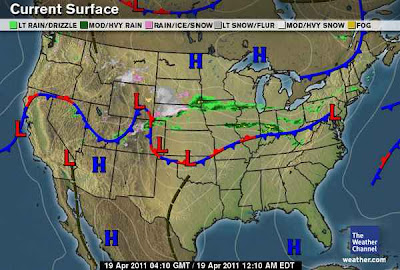 My prediction from yesterday was partially right. It was warmer at 50 degrees, but it was overcast all day with cirro/altostratus clouds. There was a wind from the E and later the SE at about 10mph. I think tomorrow will be cooler and wet as that Colorado Low from the west tracks our way!